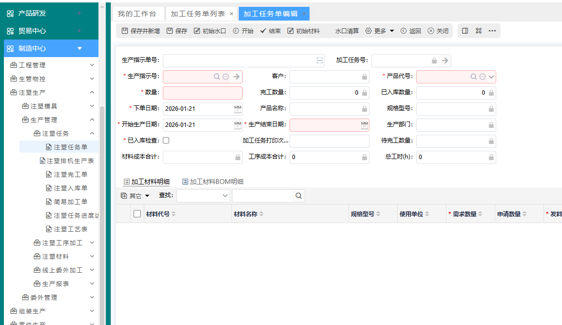 原材料与辅料管理:严格管理主料、色母、水口料(粉碎料)的入库、领用、退库、库存。支持水口料比例设定与自动扣减原料消耗。