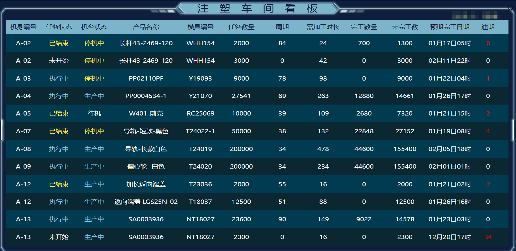 生产执行动态看板:在车间大屏实时滚动显示“计划vs实际产出”、“当日各机台状态(运行/停机/换模)”、“急单与延期订单预警”、“瓶颈机台呼叫”。